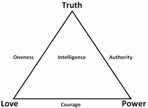 Combining the three core principles to create the other four is an interesting leap. To my mind, these four are not logically derived (Steve gives no equations anywhere) but instead stand in the place where the core principles mingle. Authority is Truth empowered, while Courage is Power motivated by Love. I’m not clear on how Truth and Love give rise to Oneness, but I can’t deny its intuitive appeal. And as for Intelligence being the combination of all three — frankly I wouldn’t have chosen this word. To me, “Intelligence” implies little more than “capacity to reason”, but Steve is using it in a transcendant sense — something more like sentience or even creativity.
